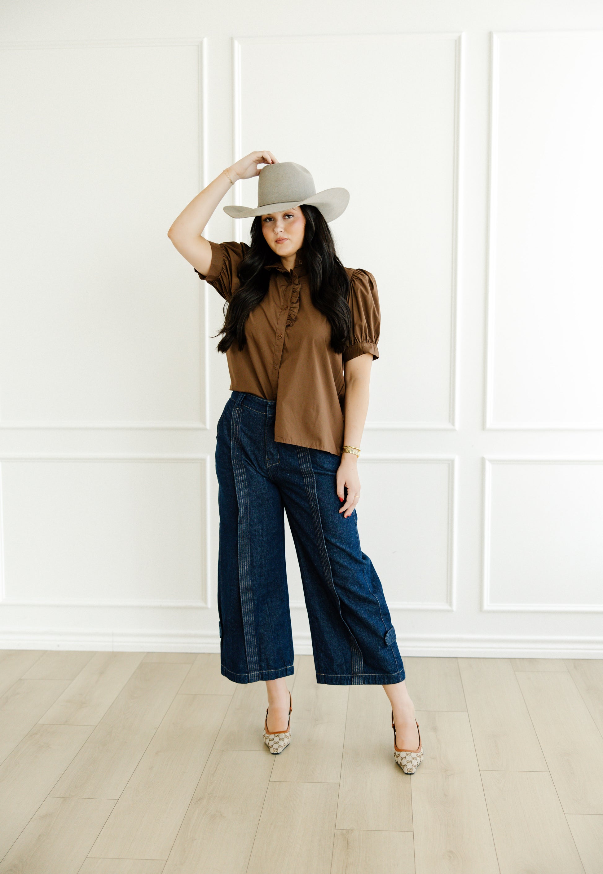 Step into fall with the Charlie Button Down Top, a chocolate brown delight featuring puff sleeves and a charming ruffled collar. This playful favorite layers effortlessly, making it your go-to for cozy days and crisp evenings. Versatile and stylish, it’s perfect for transitioning your wardrobe as the seasons change.