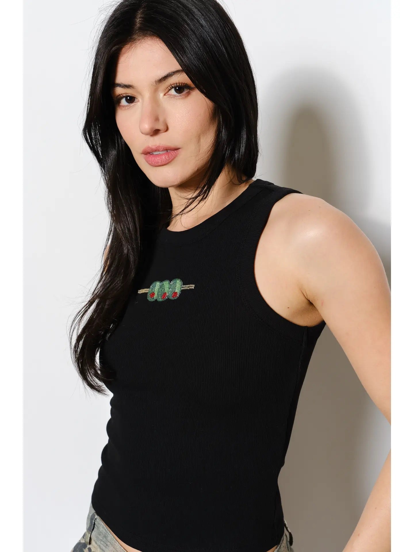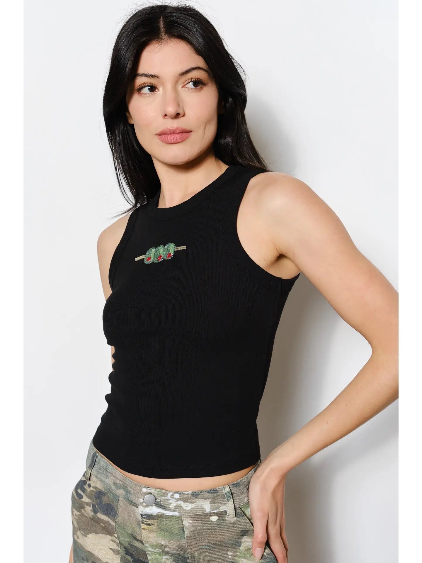 The Olive You Tank is a playful black tank top that features charming beaded olives on the front. This lightweight and comfortable piece adds a fun twist to your casual wardrobe!